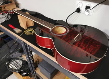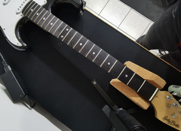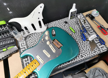 Wymiana strun. Regulacja krzywizny gryfu, akcji i menzury. Szlif korygujący progów plus polerowanie progów. Wymiana progów. Wymiana podzespołów, elektronicznych, przystawek, potencjometrów, mostków i kluczy. Konserwacja podstrunnic. Wymiana sprężyn w mostkach tremolo. Regulacja mostków typu floyd rose.